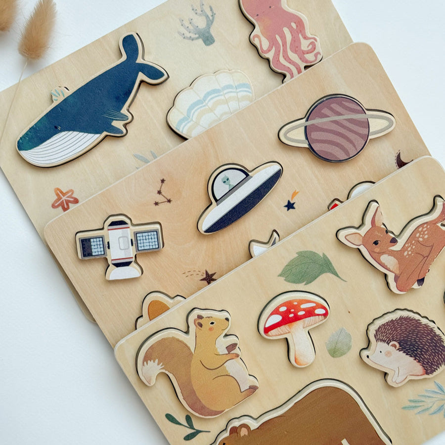 These wooden puzzles for kids are classic, hands-on educational toys designed to stimulate young minds while enhancing fine motor skills, problem-solving abilities, and hand-eye coordination. Crafted from durable solid wood. These puzzles are available in 3 themes.